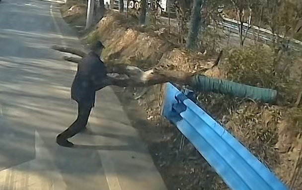 51岁的公交车司机举起“杠”搬树,一分钟就完成
